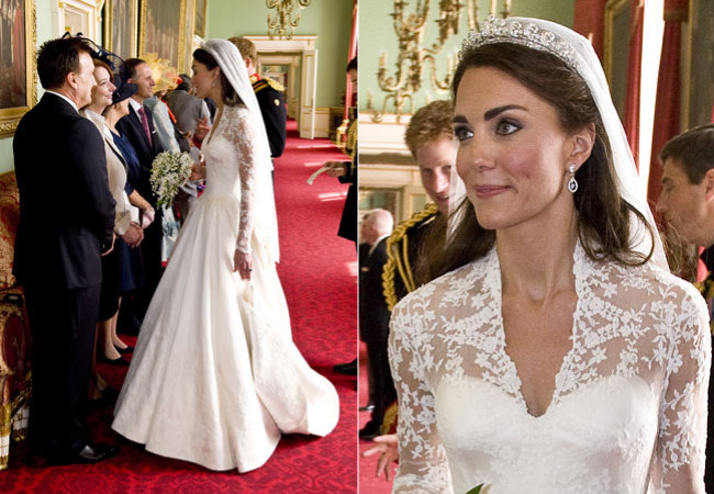 A noiva chega à Abadia de Westminster com um vestido criado por Sarah Burton diretora criativa da marca Alexander McQueen. Discreto, elegante, muito parecido com o vestido que Grace Kelly usou em seu casamento com o Príncípe Ranier de Mônaco. Maquiagem suave, destacando a beleza e personalidade da Duquesa de Cambridge.