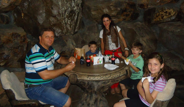 ... e por aqui encontramos a Caverna do Dino, uma lanchonete temática onde fizemos uma parada para um lanchinho e "descansadinha"... o parque é grande mas dá para fazer as trilhas em uma manhã ou tarde... existem várias outras atrações como o Santuário, a Aldeia dos Índios, passeio no Dino Móvel, cineminha, teatro com o tema da preservação ambiental, felinos que se movimentam e emitem sons... ao final do passeio ainda fizemos a degustação de chocolates na Mina de Chocolate Floryball... vale a pena conhecer este lugar, nós adoramos!!! Beijosss!!! ♥